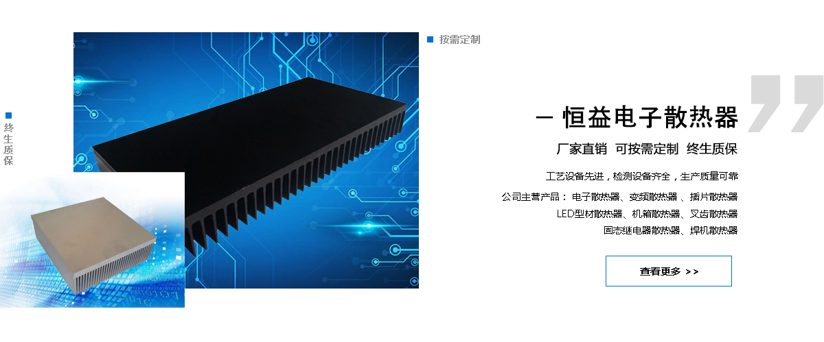 鎮江新區恒益電子有限公司(原鎮江新區電子電器廠),創建于2004年,是專業制造銷售“恒益”牌系列散熱器及電子、電器設備等產品的企業。主營 電子散熱器 、 變頻散熱器 、 插片散熱器 、 型材散熱器 、機箱散熱器、叉齒散熱器、固態繼電器散熱器、焊機散熱器 。本廠研制生產的"恒益"牌散熱器是電子半導體器件獲得長壽命、高效率,提高整機質量的重要保證。散熱器系列適用于交直流電源、穩壓電源、開關電源、通訊電源、凈化電源、廣播電視發射裝置、變頻電源、逆變電源等各種電源產品; 還適用于日光燈電子鎮流器、音響設備、功放電路、自動控制儀等電力電子產品領域。